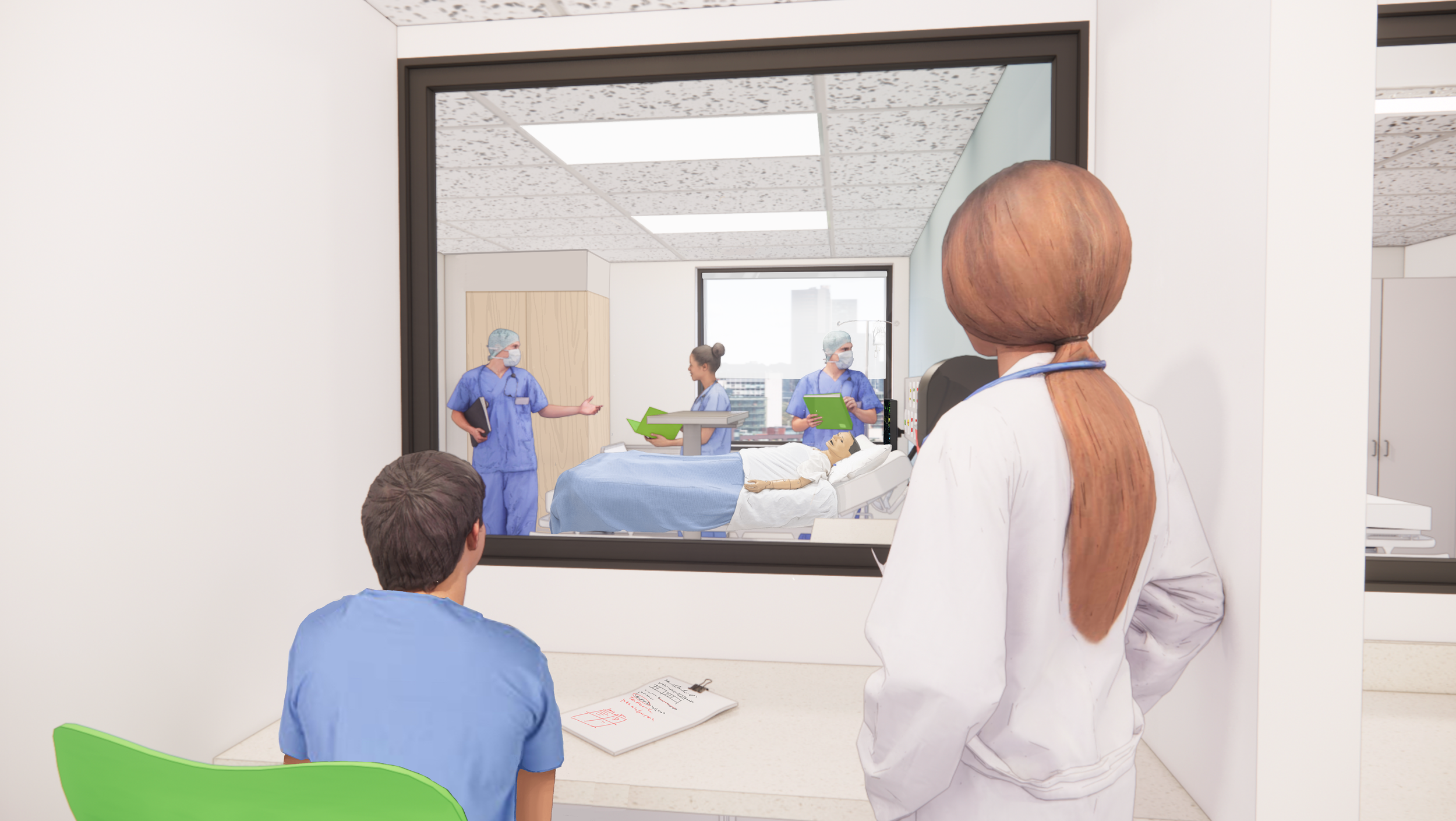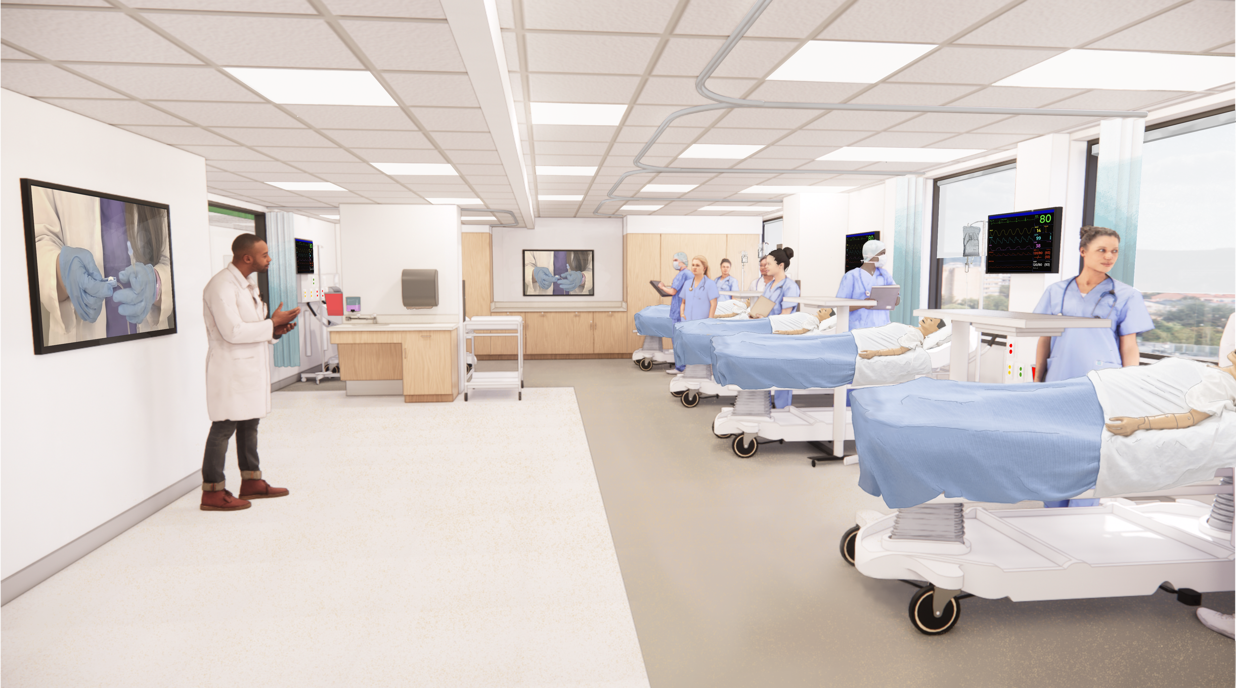 The facility provides specialized instructional and simulation spaces designed to mirror real-world healthcare settings, including classrooms, a skills lab, simulation labs, observation and debrief rooms, and dedicated student study and lounge areas. An administrative suite supports faculty and staff functions with offices, conference and testing rooms, and collaborative spaces.